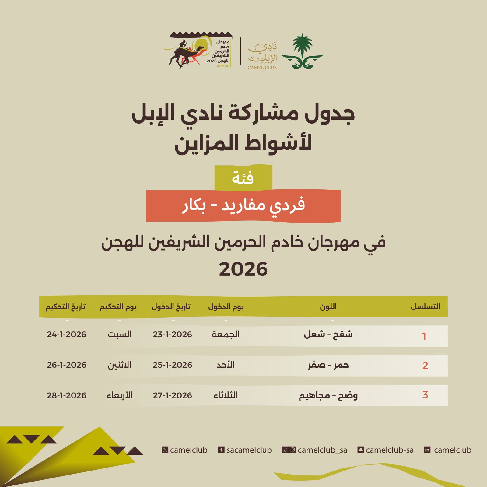 جدول المهرجان ( مزاين الإبل مفاريد بكار الإتحاد السعودي للهجن - مهرجان خادم الحرمين الشريفين للهجن - النسخة الأولى )