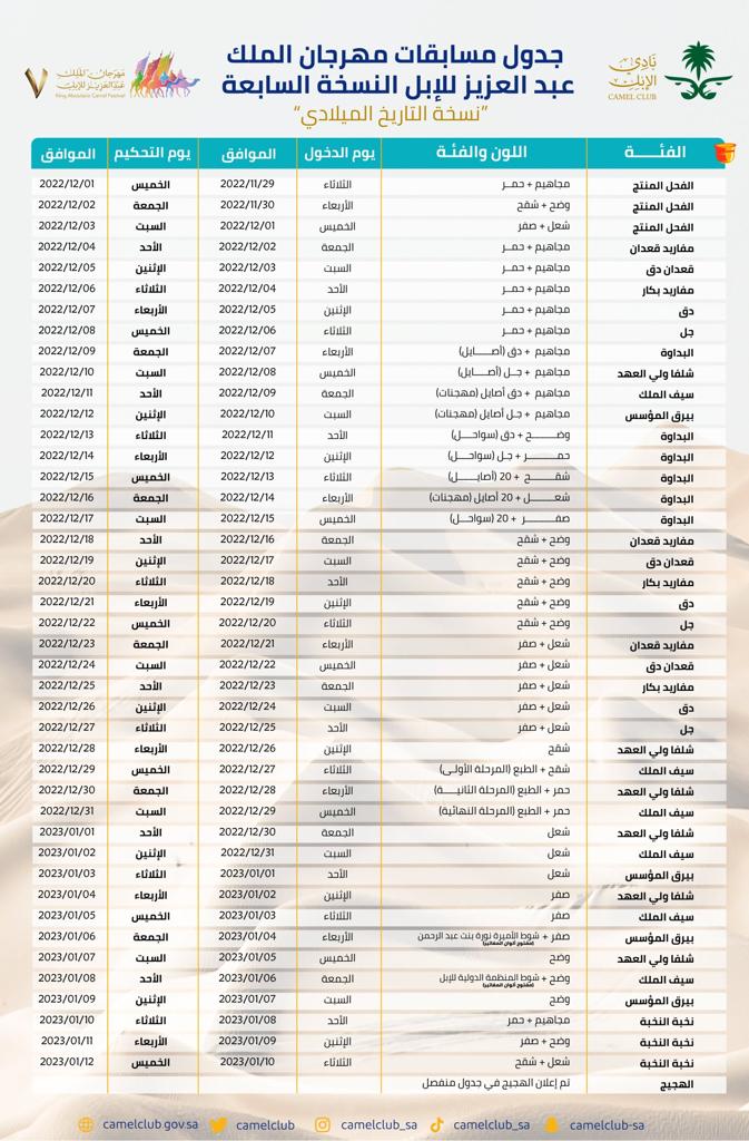 جدول المهرجان ( مهرجان الملك عبدالعزيز للإبل - النسخة السابعة )